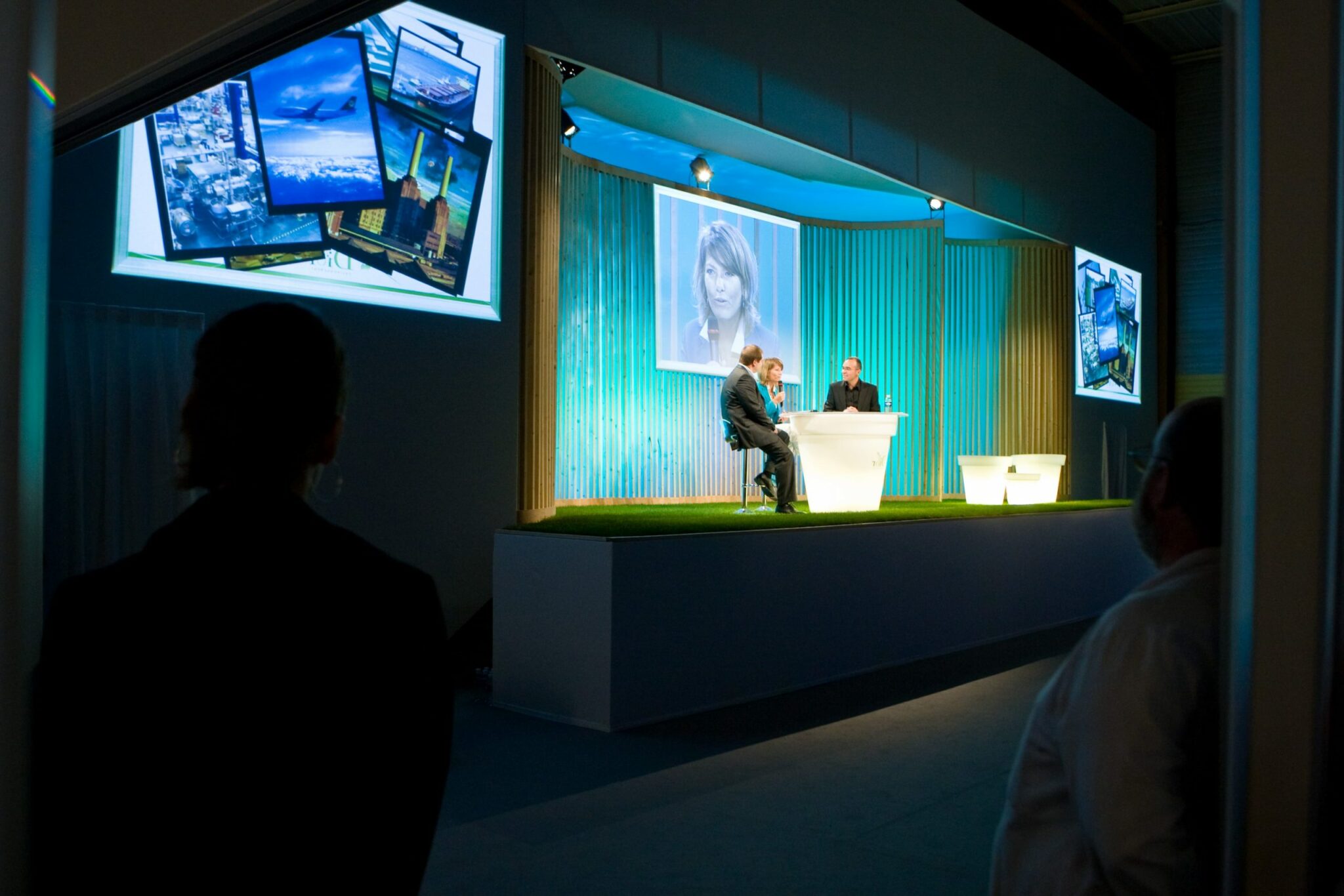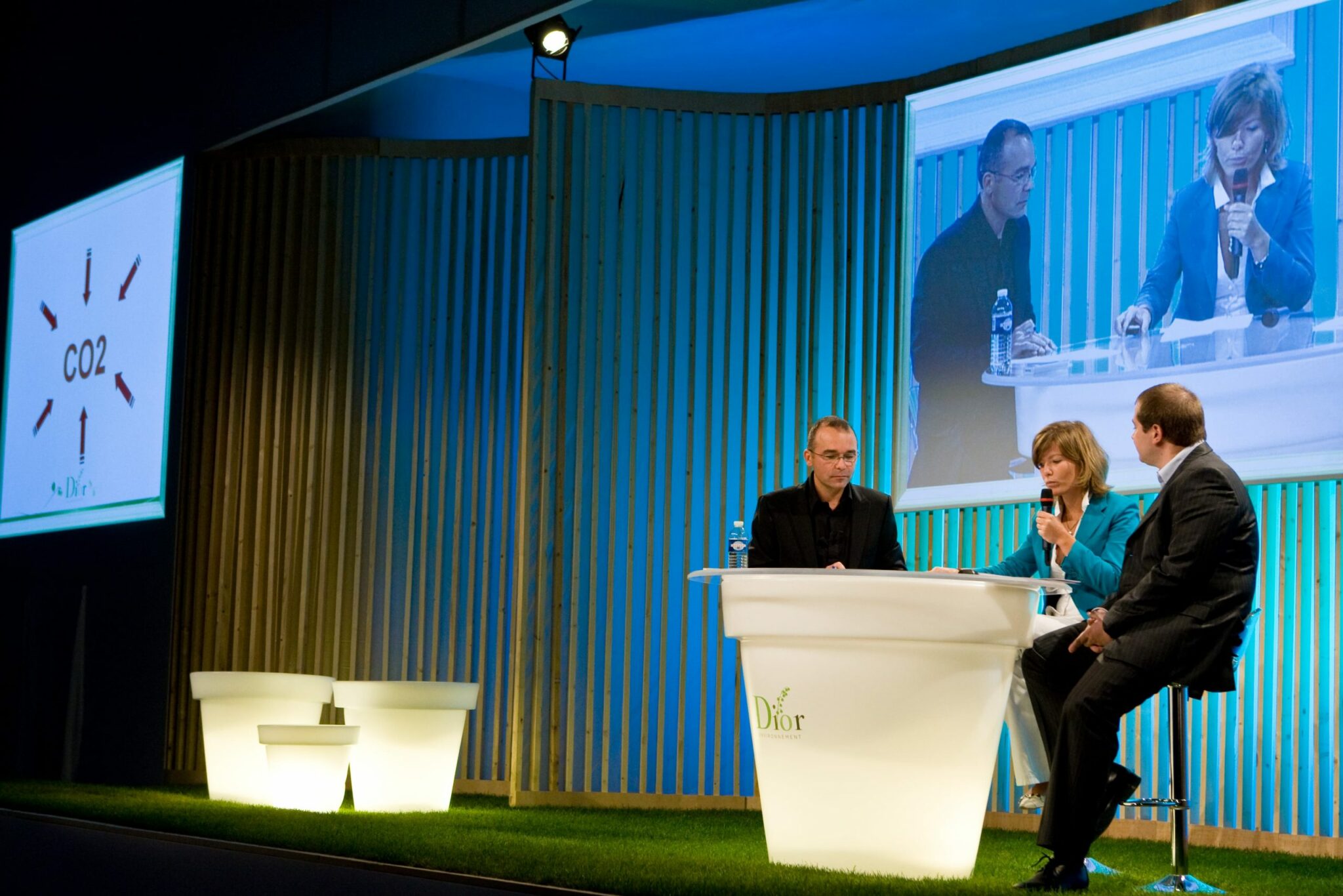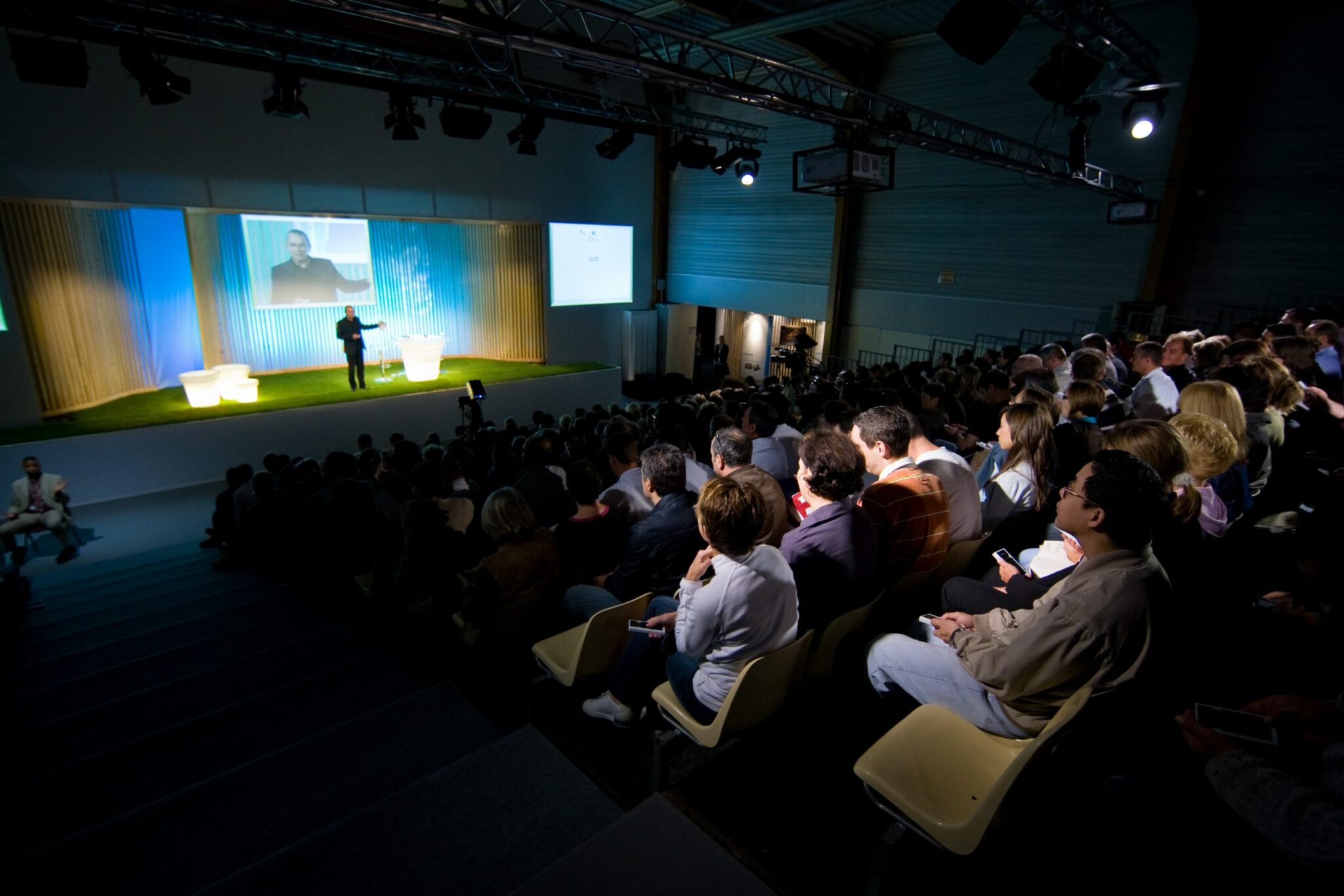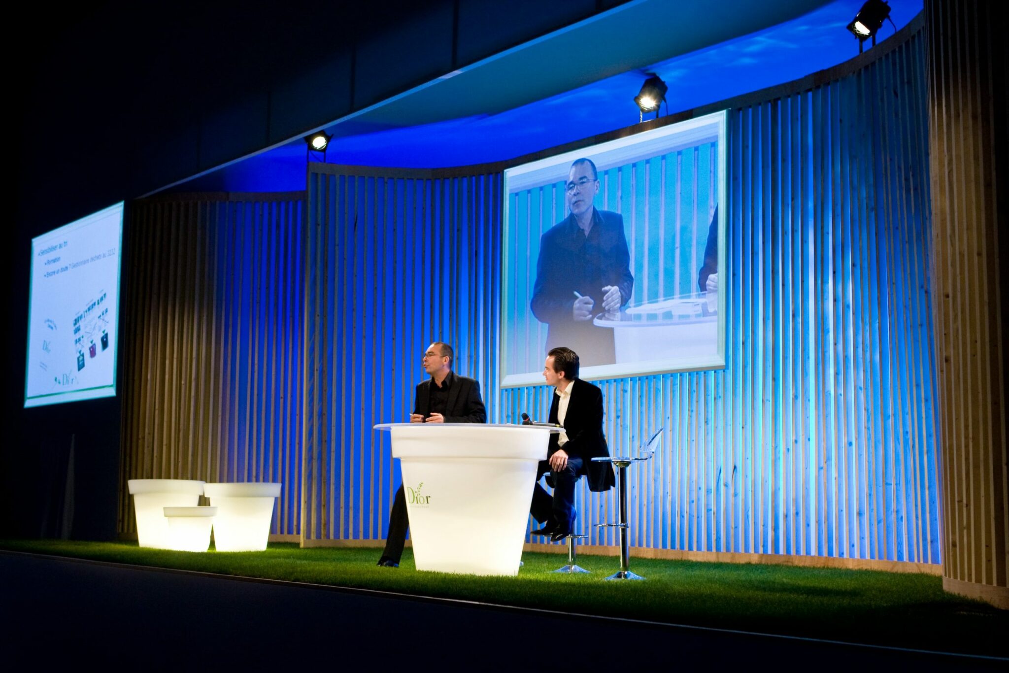 La scène habituellement réservée au spectacles de théâtre ou de danse a servi de plateau pour les intervenants qui ont présenté leurs sujets dans un univers inspiré d’un jardin, gazon naturel à la place de la moquette, pot lumineux en guise de tribune, claustra en tasseaux comme fond de scène.