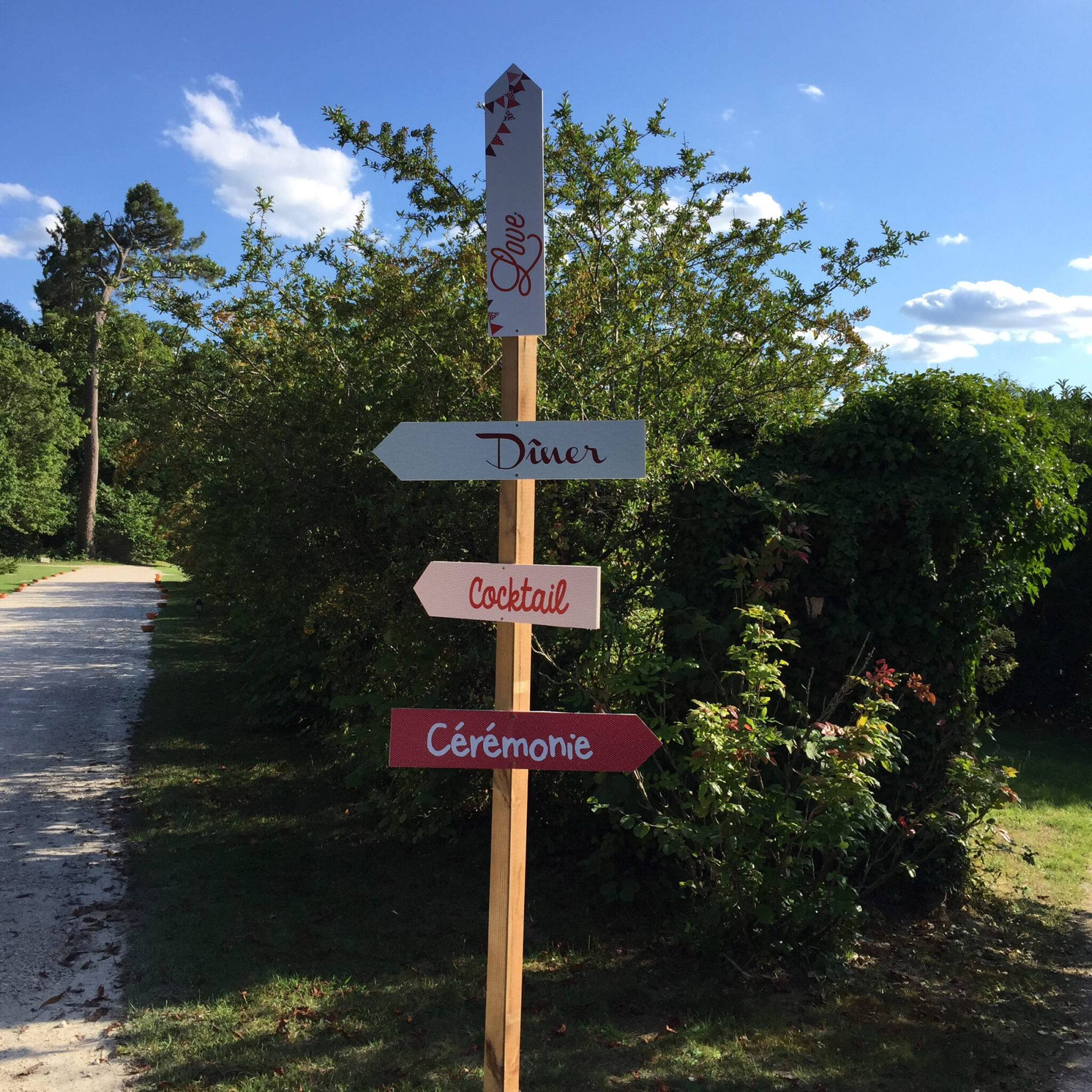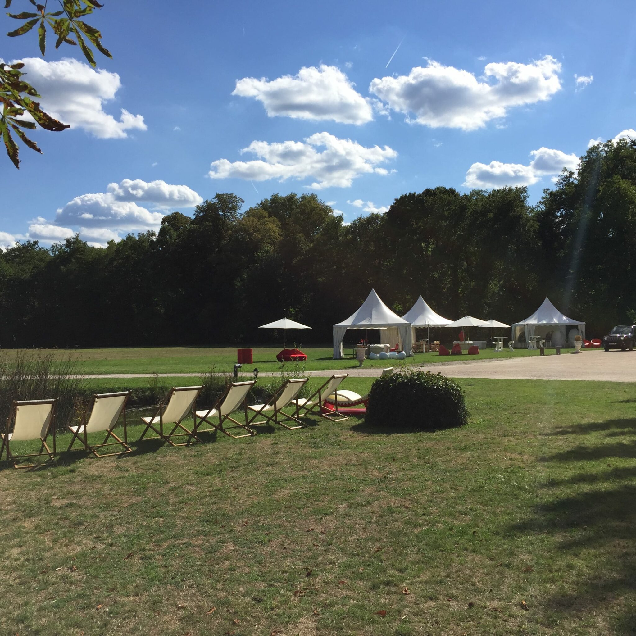 Nous avons donc poussé l’originalité jusqu’à leur proposer d’installer un mobilier dépareillé mais respectant les codes coloriels dans le parc du château où se déroulait le vin d’honneur.