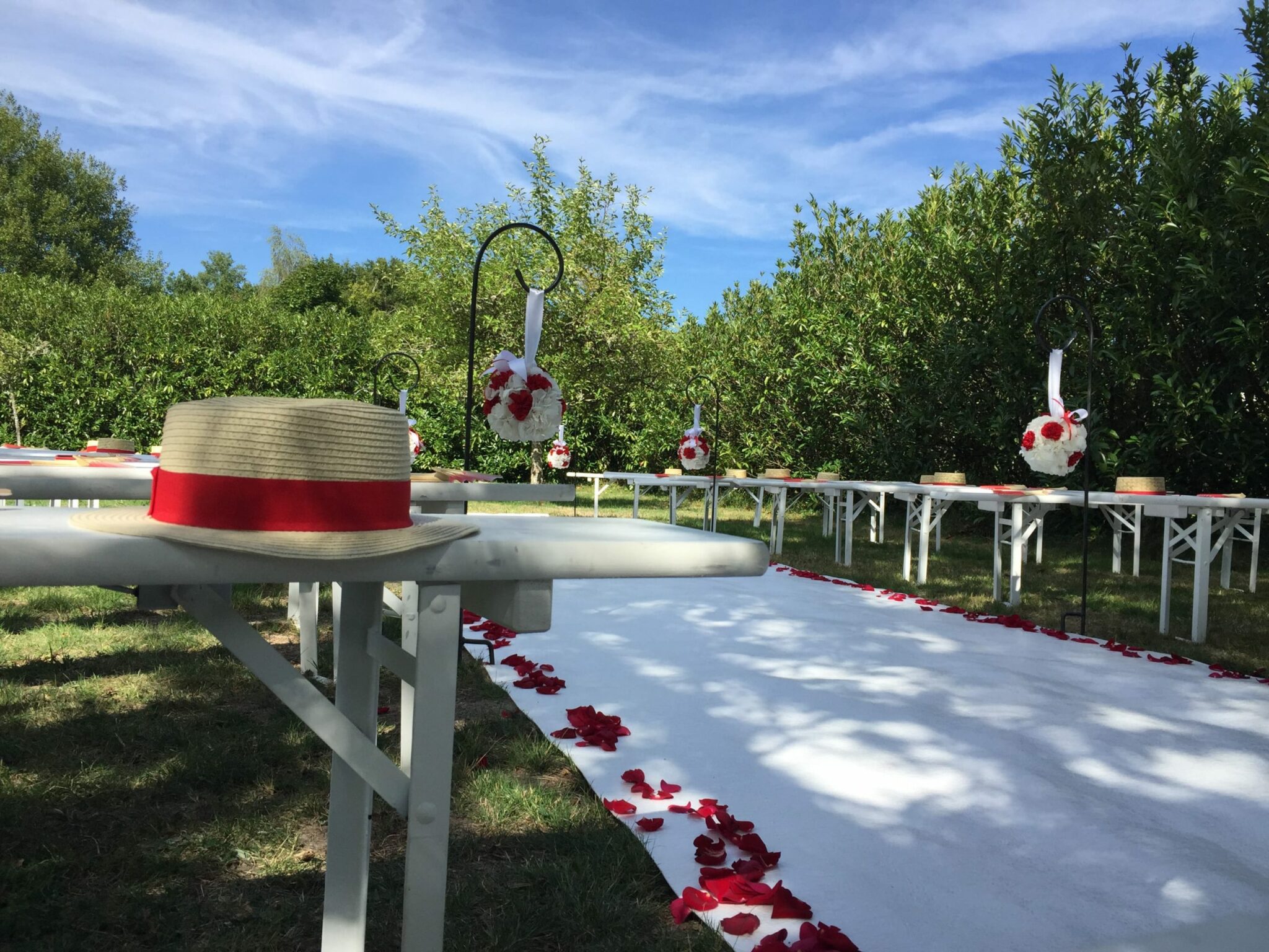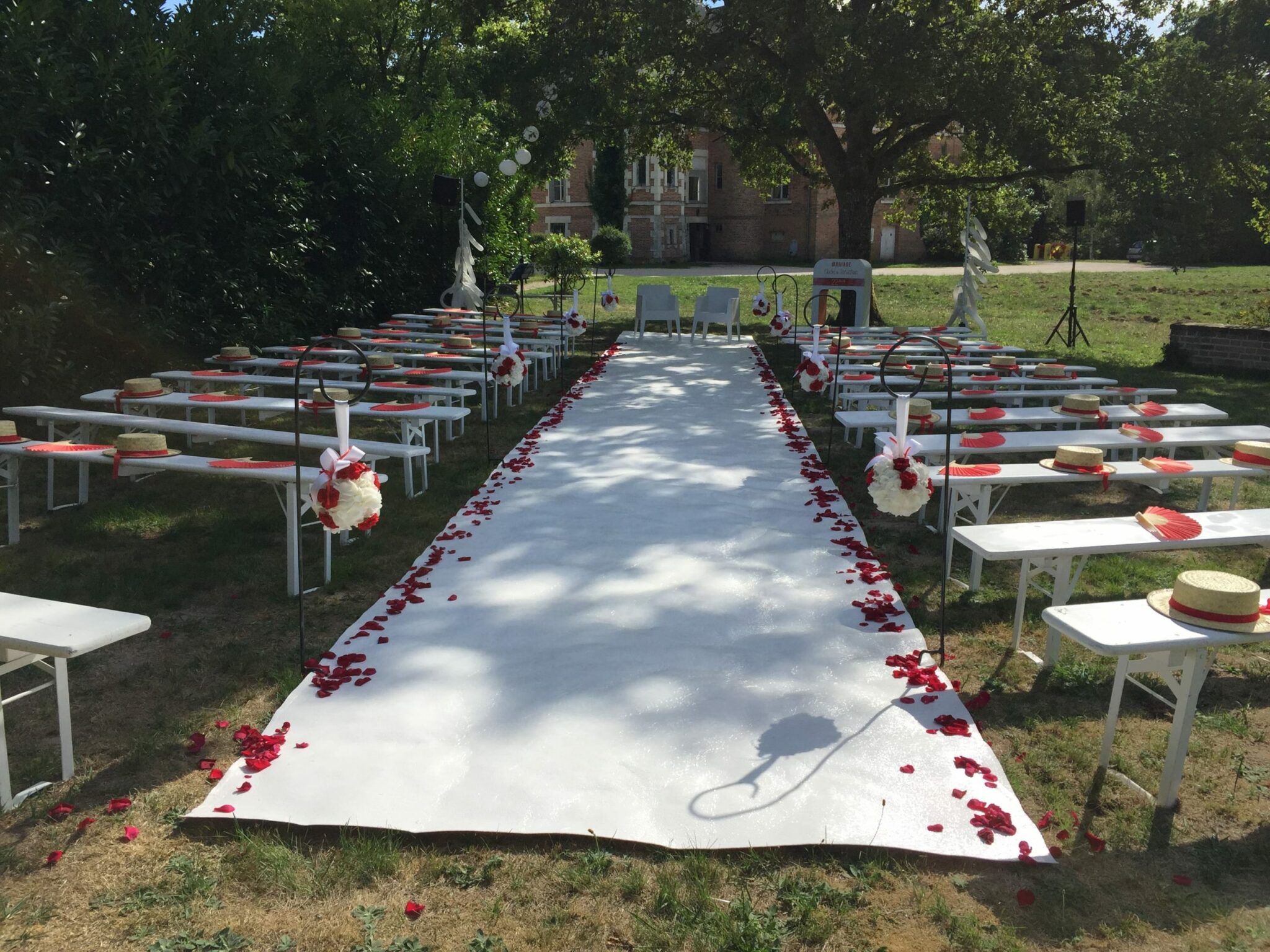 Pour la cérémonie laïque, les invités étaient assis sur des bancs immaculés répartis de part et d’autre d’une allée blanche parsemée de pétales de fleurs et et ornées de boules de roses suspendues.