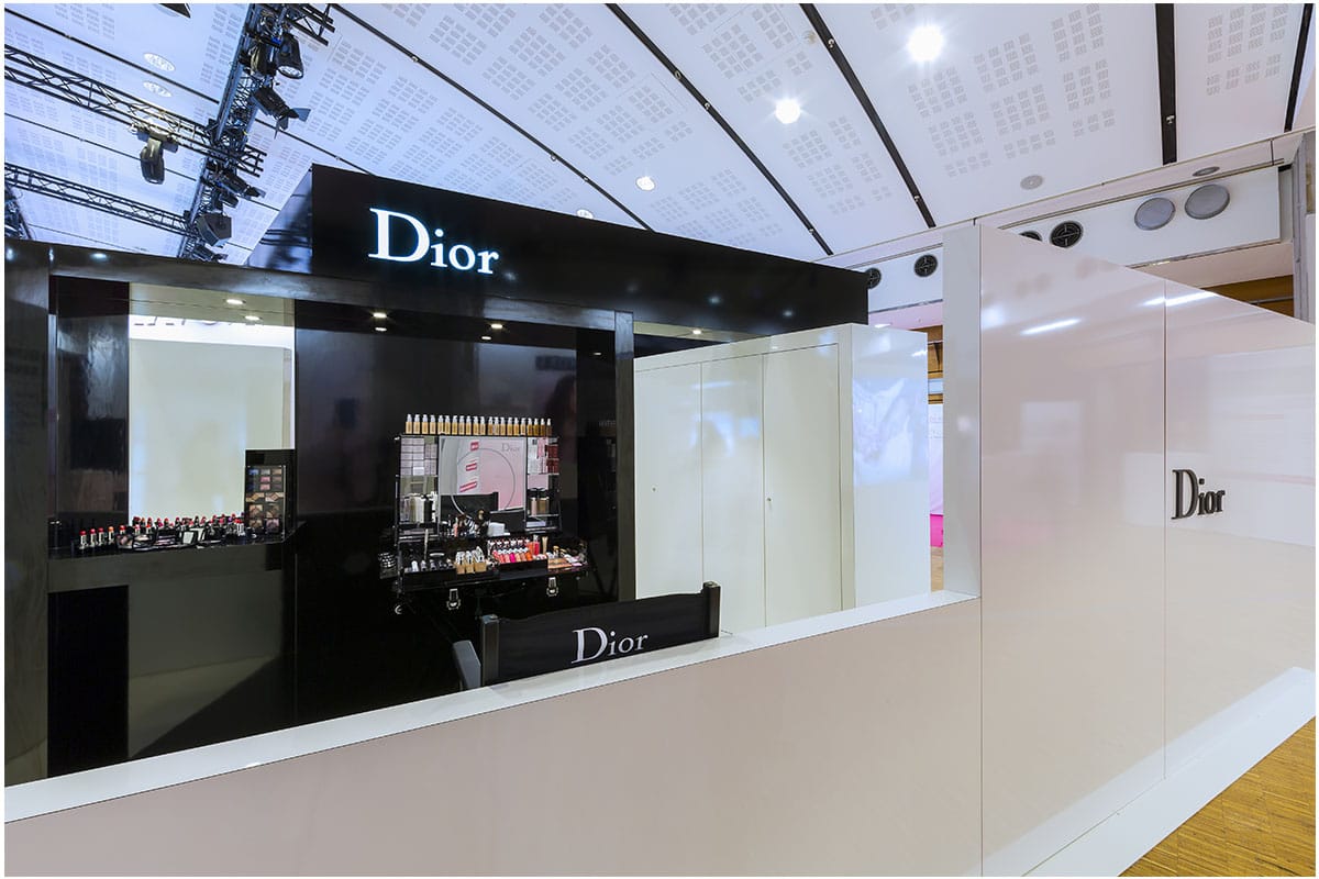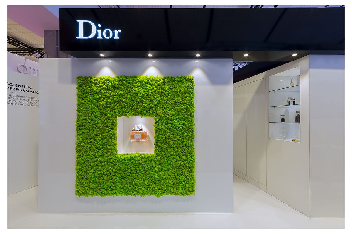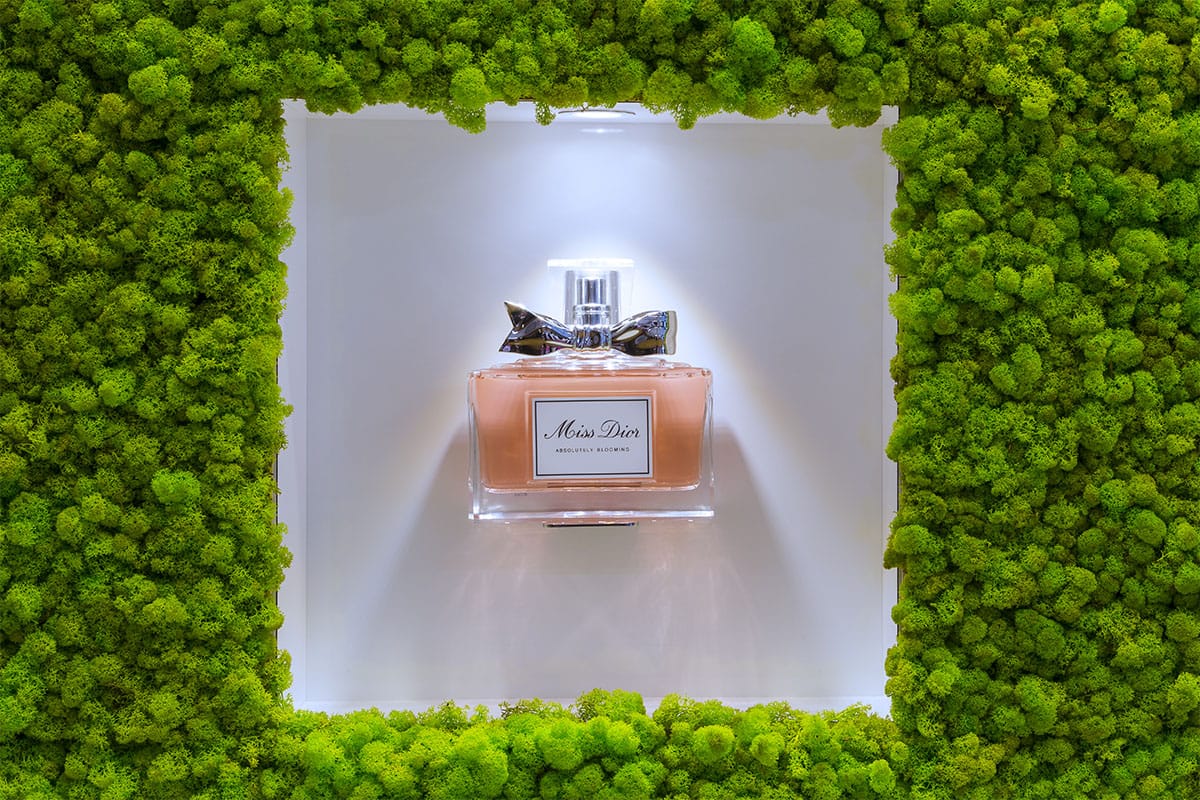 Nous avons conçu cet espace tel un corner de grand magasin, laqué blanc et noir, laissant une belle place aux produits de la marque et offrant au parfum Miss Dior un espace privilégié dans un écrin végétalisé.