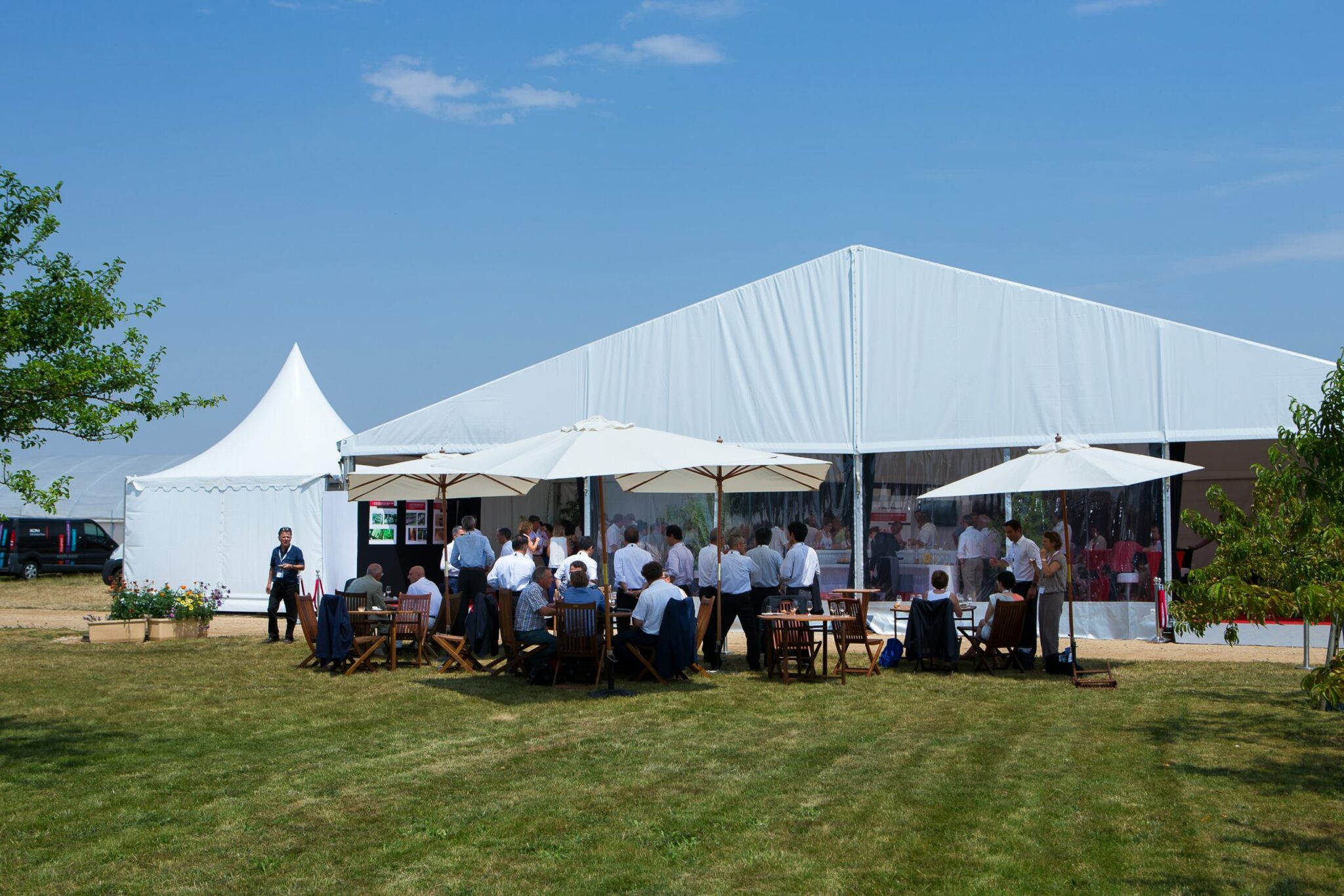 Nous avons donc installé une tente dans les champs, que nous avons aménagée en plusieurs zones. L’une pour organiser la plénière, ce qui nécessitait une occultation totale pour permettre la projection des supports audiovisuels, et l’autre ouverte sur l’extérieur pour l’exposition de photos et panneaux pédagogiques et pour le cocktail déjeunatoire.